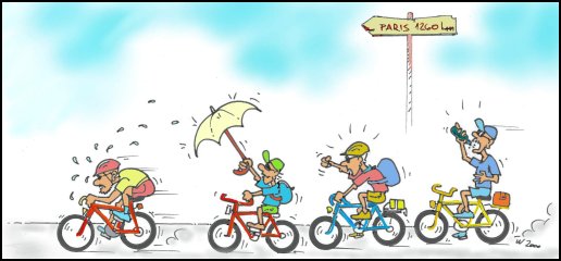 Med pripravami je cela ekipa opravila temeljit zdravniški pregled. Po opravljeni ciklometriji zdravnik, skoraj začuden, komentira rezultate starejšega mladinca Tomaža. »Vi ste pa medicinski fenomen! Pod obremenitvijo se vam vsi parametri bistveno izboljšajo, celo nekoliko povišan pritisk se normalizira«. Tomaž zadovoljen primaha domov, saj se že vidi v Parizu. Žena, ki bi ga rada večkrat videla doma, se pozanima za njegovo zdravstveno stanje. »Odlično«, pravi Tomaž, »samo malo povišan pritisk«. Žena pa: »ti je predpisal kakšno zdravilo?« Tomaž pa kot iz topa: »Seveda, bicikel!«